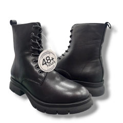 Bota estilo militar track en piel con plataforma doble goma antideslizante. Cierre acordonado y cremallera en lado interno.