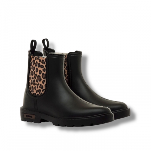 Botines de agua planos de color negro para mujer, modelo Halo de Mustang. Este diseño tipo chelsea incorpora paneles laterales elásticos con estampado de leopardo, que aportan un toque llamativo y actual. Su suela con relieve lo convierte en una opción cómoda para el uso diario. Ideal para combinar con jeans o prendas básicas, este botín es perfecto para dar un aire diferente a looks de entretiempo o días lluviosos.