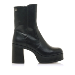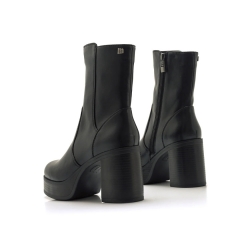 Botín de tacón alto Sixties Mustang para mujer. Diseñadas en cuero sintético de color negro, destacan especialmente gracias a su alta plataforma. Caña ajustada. Tacón de bloque de efecto madera. tachuela con el logo de la marca en la parte superior de la caña. Querrás que formen parte tanto de tus looks para vestir, como de tus looks más informales.