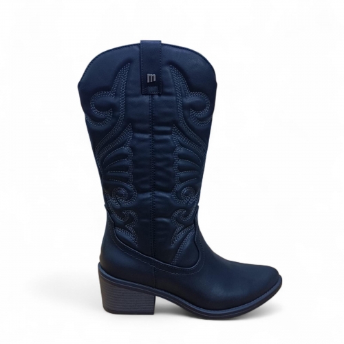Bota cowboy de color negra para mujer, modelo Tanubis de Mustang. Este diseño de caña media resalta por sus bordados decorativos en hilo claro que contrastan con el acabado desgastado del corte. La puntera ligeramente afilada y el tacón medio ancho aportan un equilibrio entre estilo y comodidad. Con cremallera interior para facilitar el calce y tiradores superiores que refuerzan su estética western, es una opción ideal para darle un aire vaquero a tus looks.
