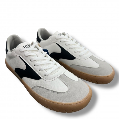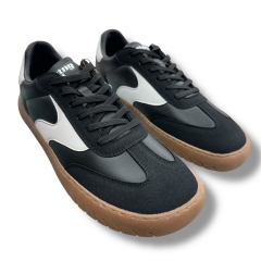 Zapatillas casual de color negro para hombre, modelo Free Jym de la marca Mustang. Su diseño combina paneles en tonos oscuros con detalles blancos en los laterales y talón, creando un contraste dinámico sobre la suela marrón de dibujo marcado. Presenta una silueta clásica de corte bajo, ideal para el día a día. Diseñadas y desarrolladas especialmente en colaboración con el Dr. Juanjo López, traumatólogo deportivo, para respetar el desarrollo natural del pie. Se trata de un calzado minimalista que gracias a su puntera ancha, suela totalmente plana (cero drop) y flexibilidad, mejora la anatomía del pie y favorece una mejor posición del mismo. Se vende con una plantilla de transición para hacer el cambio de calzado convencional a minimalista de manera progresiva. Con certificado VEGANO sellado por INESCOP, el cual garantiza que la naturaleza química principal del material no se corresponde con fibras de origen animal.