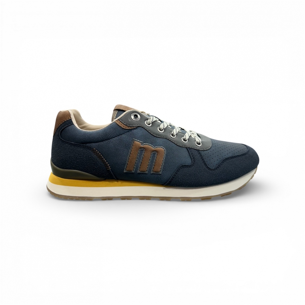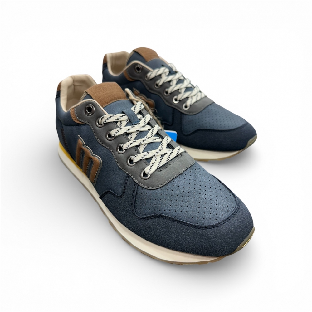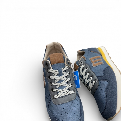 Zapatillas de color azul para hombre de la marca Mustang, modelo Porland, estilo retro running. Este modelo combina diferentes texturas en el exterior y detalles en contraste en marrón, verde y amarillo que le aportan un aire deportivo y versátil. El logotipo lateral en relieve y los cordones bicolor refuerzan su personalidad, mientras que la suela tipo plataforma con acabado dentado en color caramelo añade un toque distintivo. Equipadas con plantillas con tecnología Starfit, que mejoran la comodidad en cada paso. Perfectas para quienes buscan comodidad sin renunciar al estilo casual.