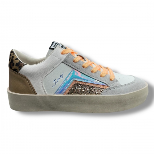 Zapatillas blancas Lauper para mujer de color blanco de la marca Mustang. Este diseño combina texturas y colores como dorado, glitter naranja y estampado animal en el talón, creando un look original y moderno. La suela es de plataforma y los cordones en tono naranja añaden un toque juvenil y llamativo. ¡Se diferente con Lauper de Mustang!
