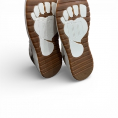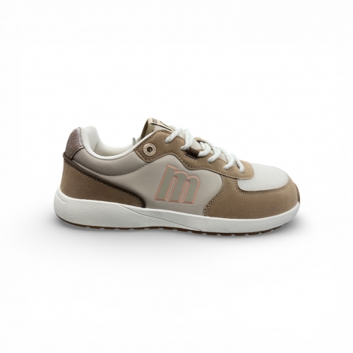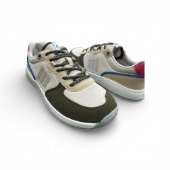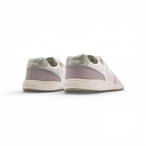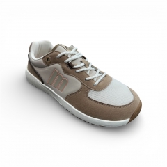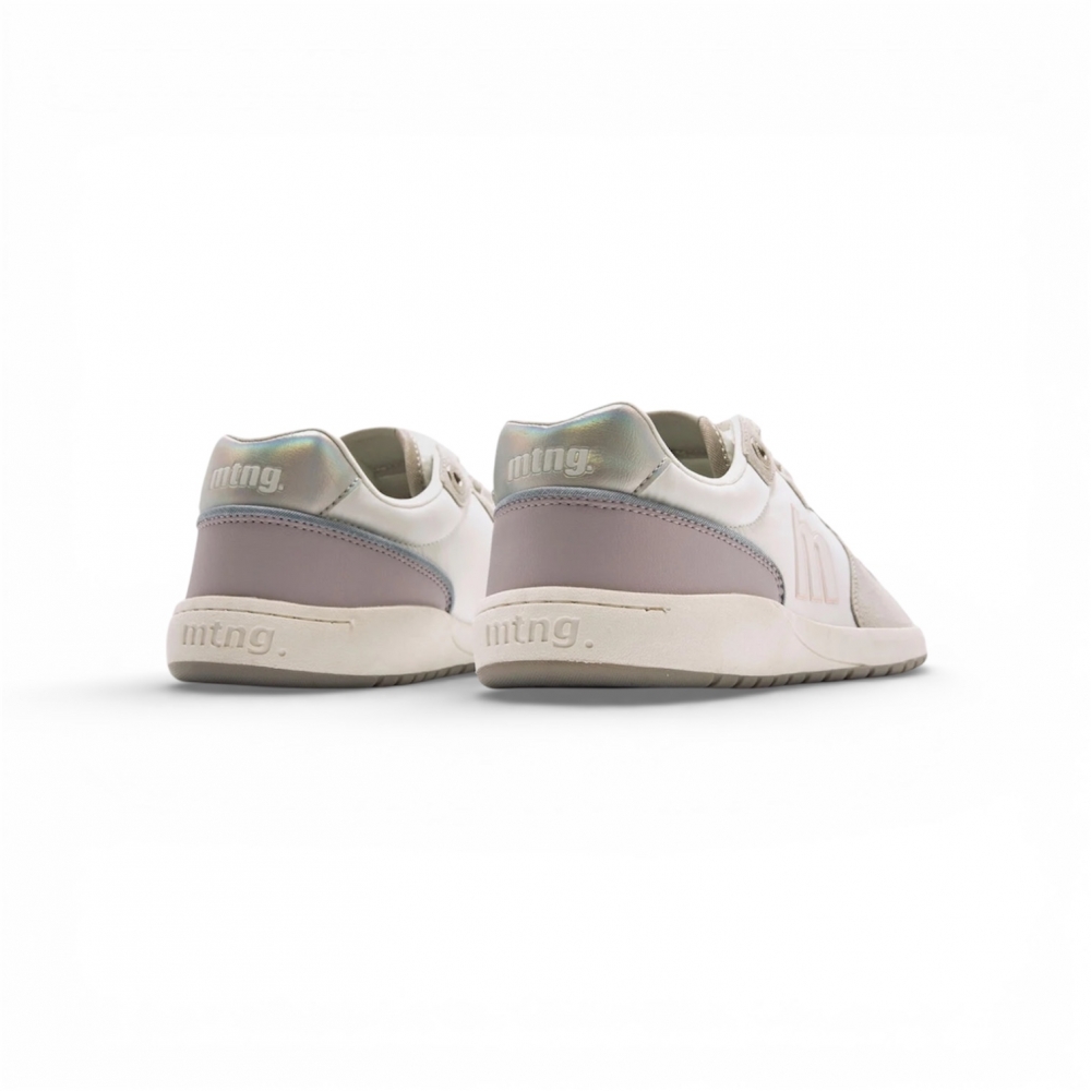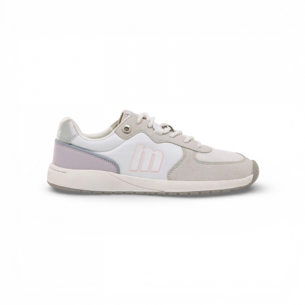Zapatillas barefoot para mujer, modelo Free Apolo de la marca Mustang de color blanco. Presenta una combinación de texturas con piezas en gris claro, detalles en lila y azul suave, y refuerzo trasero con acabado iridiscente. El diseño incorpora cierre con cordones y logo lateral en contraste. Diseñadas y desarrolladas especialmente en colaboración con el Dr. Juanjo López, traumatólogo deportivo, para respetar el desarrollo natural del pie. Se trata de un calzado minimalista que gracias a su puntera ancha, suela totalmente plana (cero drop) y flexibilidad, mejora la anatomía del pie y favorece una mejor posición del mismo. Se vende con una plantilla de transición para hacer el cambio de calzado convencional a minimalista de manera progresiva. Perfecta para quienes buscan un estilo deportivo con un toque de color.