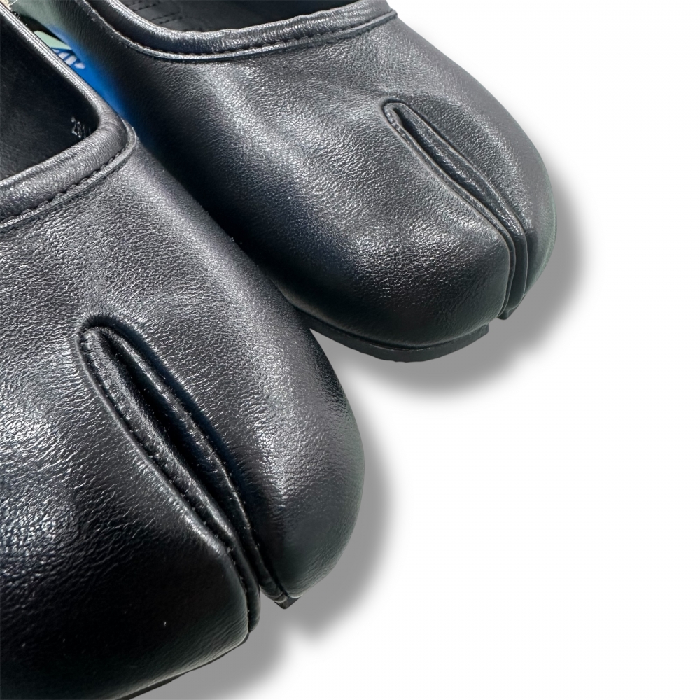 Bailarina plana con puntera tipo tabi de la marca Mustang, modelo Tabatha de color negro para mujer. Este diseño incorpora una ligera separación frontal de los dedos, junto a una suela fina que aporta comodidad. Su acabado liso se completa con el logo metálico trasero, encajando fácilmente en looks urbanos o más formales. Con certificado VEGANO sellado por INESCOP, el cual garantiza que la naturaleza química principal del material no se corresponde con fibras de origen animal.