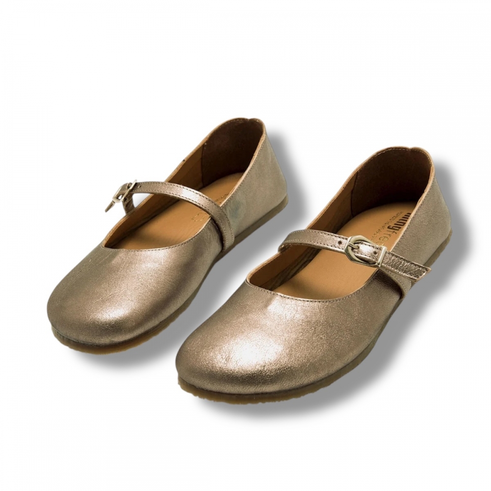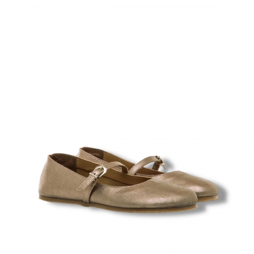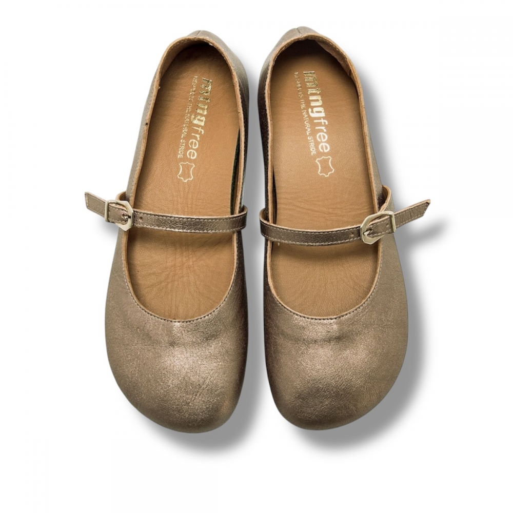 Bailarinas de piel doradas para mujer de la marca Mustang, modelo Free Mia. Con un estilo clásico con un toque de brillo, la tira al empeine con hebilla ajustable proporciona mayor sujeción sin comprometer la libertad. Diseñadas y desarrolladas especialmente en colaboración con el Dr. Juanjo López, traumatólogo deportivo, para respetar el desarrollo natural del pie. Se trata de un calzado minimalista que gracias a su puntera ancha, suela totalmente plana (cero drop) y flexibilidad, mejora la anatomía del pie y favorece una mejor posición del mismo. Al estar fabricadas con piel natural, la plantilla puede presentar un aspecto arrugado o irregular en algunas zonas, algo completamente normal que no afecta al uso y que refleja la autenticidad y singularidad del material.