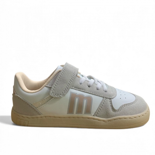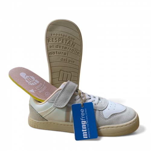 Zapatillas de color blanco con detalles en beige y rosa para niña de la marca Mustang, modelo Free. Diseñadas para ofrecer comodidad y estilo con su cierre combinado adhesivo y cordones elásticos, estas zapatillas destacan por su ajuste práctico y su diseño reforzado en la puntera y los laterales. La combinación de colores suaves les da un toque versátil. Diseñada y desarrollada especialmente en colaboración con el Dr. Juanjo López, traumatólogo deportivo e infantil, para respetar el desarrollo natural del pie de los niños. Gracias a su puntera ancha permite el libre movimiento de los dedos dentro del zapato. Su suela tiene 3 mm de grosor y con zero drop (totalmente plana) respeta el natural desarrollo del pie del pequeño y sus elementos flexibles y torsionables hace que el pie del niño no esté encorsetado por la estructura del zapato. Las plantillas extraíbles y las marcas de los dedos en la misma, facilita comprobar si la talla del calzado es la correcta para tu hijo. Además, su fácil apertura facilita que el niño pueda descalzarse y calzarse de forma autónoma. Acompaña los primeros pasos de tu bebé con Mustang. Con certificado VEGANO sellado por INESCOP, el cual garantiza que la naturaleza química principal del material no se corresponde con fibras de origen animal.