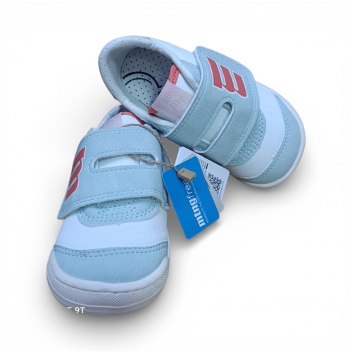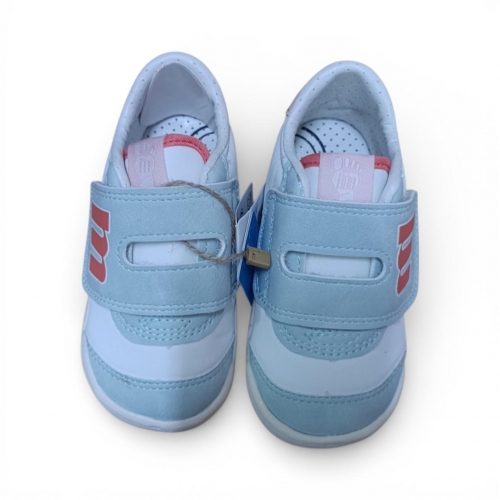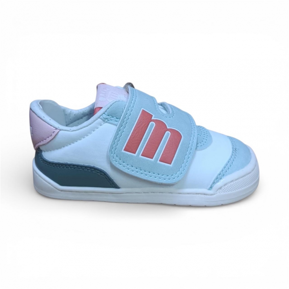 Zapatillas barefoot para bebé de la marca Mustang, modelo Free Baby de color blanco con detalles en verde. Destaca por su diseño en tonos aguamarina y rosa claro, combinado con el logo coral en la tira adhesiva que aporta un toque moderno. Diseñada y desarrollada especialmente en colaboración con el Dr. Juanjo López, traumatólogo deportivo e infantil, para respetar el desarrollo natural del pie de los niños. Gracias a su puntera ancha permite el libre movimiento de los dedos dentro del zapato. Su suela tiene 3 mm de grosor y con zero drop (totalmente plana) respeta el natural desarrollo del pie del pequeño y sus elementos flexibles y torsionables hace que el pie del niño no esté encorsetado por la estructura del zapato. Las plantillas extraíbles facilitan comprobar si la talla del calzado es la correcta para tu hijo. Además, su fácil apertura facilita que el niño pueda descalzarse y calzarse de forma autónoma. Acompaña los primeros pasos de tu bebé con Mustang. Con certificado VEGANO sellado por INESCOP, el cual garantiza que la naturaleza química principal del material no se corresponde con fibras de origen animal.
