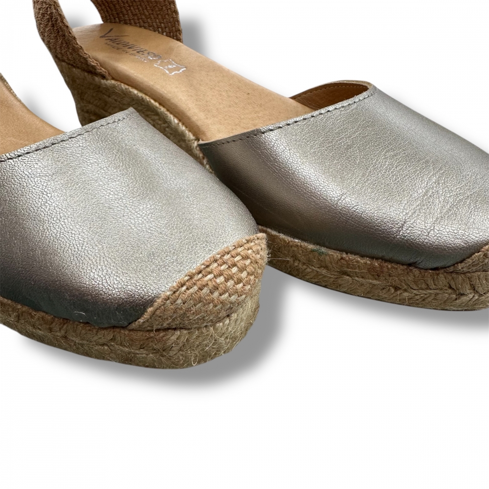 Cuñas de esparto tipo alpargatas fabricadas en piel natural.