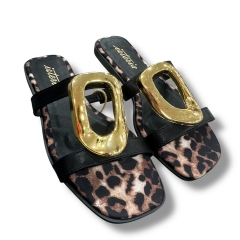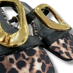 Sandalia tipo müller con acabados en leopardo y hebilla central.