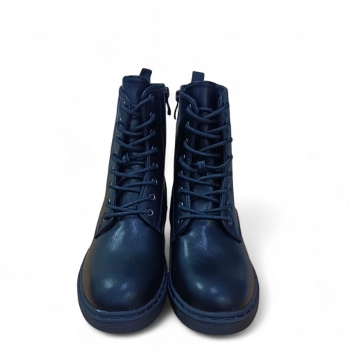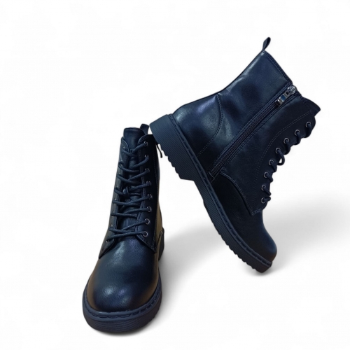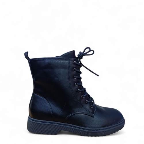 botas negras planas con cierre acordonado de estilo militar.