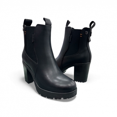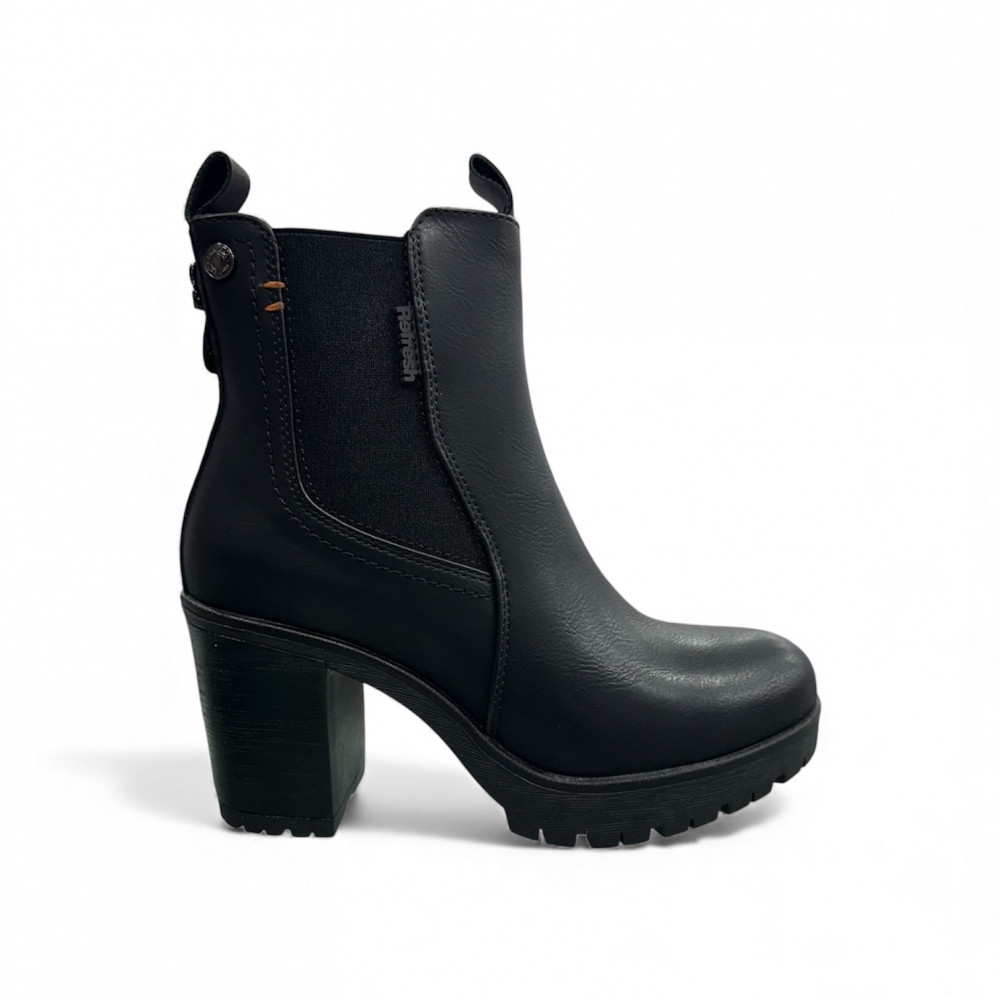 Botín de mujer, de la marca Refresh. Fabricado en un material que imita la piel. Cierre mediante cremallera interior. Modelo tipo Chelsea con elástico lateral y tirador trasero para facilitar la puesta. Tacón ancho de 9 cm con suela de goma antideslizante. Tirador trasero para facilitar la puesta. Con plantilla extraíble. Este modelo ha obtenido el certificado vegano por la organización mundial PETA (Organización de los derechos de los animales).